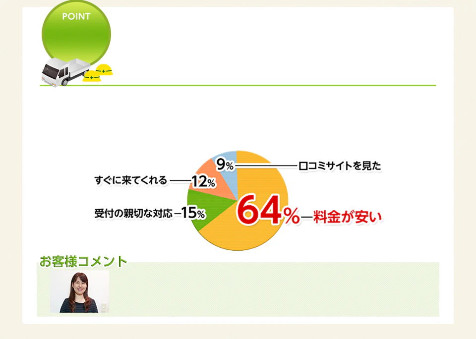 ご利用のお客様に利用していただいた、決め手をお伺いいたしました!様々なコストカットを実施することで、お客様には低価格として還元をしております。